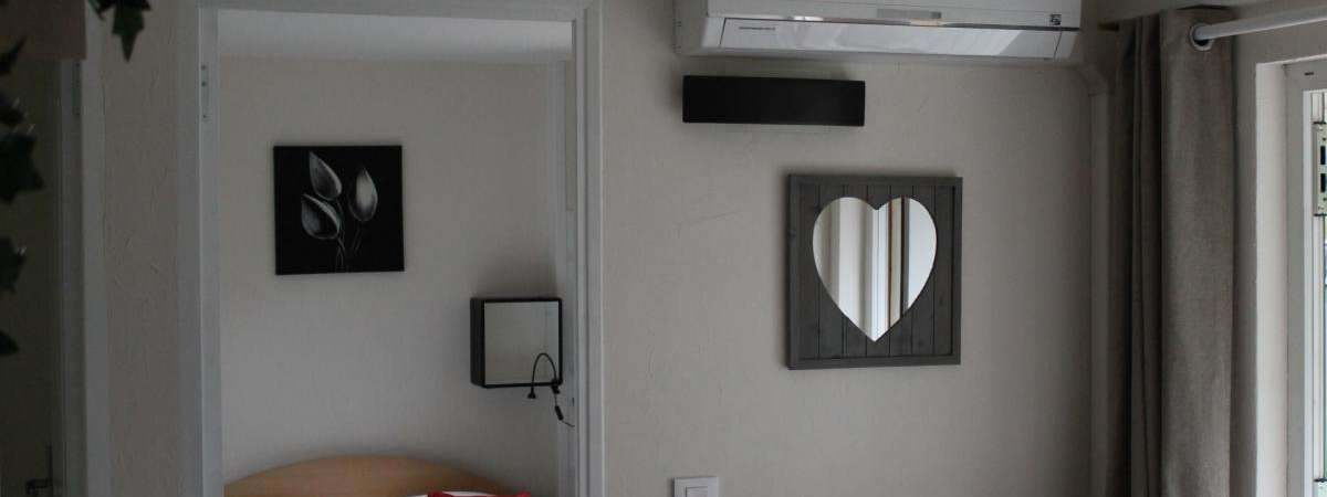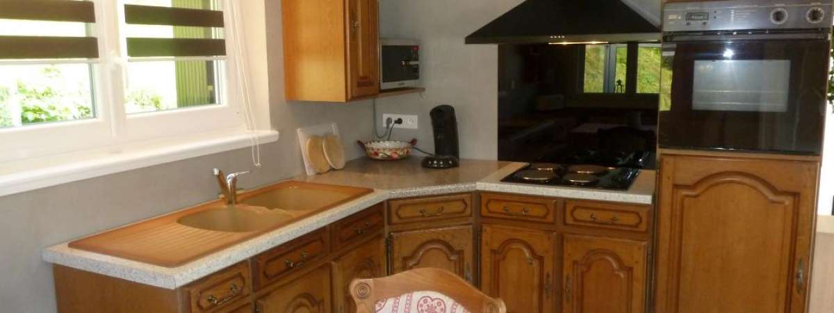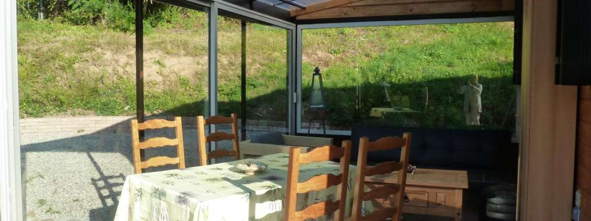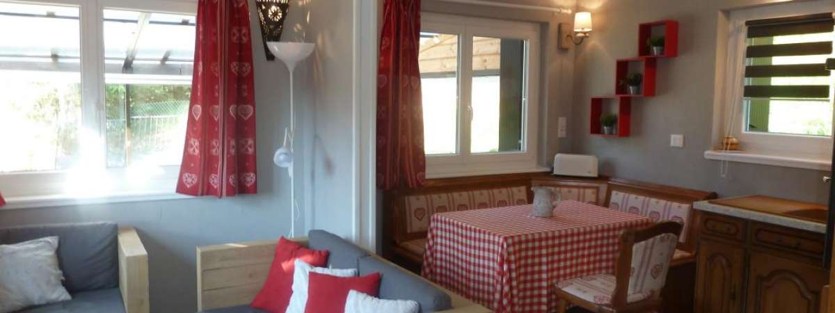 CH1 (1 lit 2p), CH2 (1 lit 1p), séjour avec cuisine ouverte (micro-ondes) et espace repas, salle d'eau avec wc. Chauffage électrique inclus. Terrasse couverte avec mobiler de jardin et espace détente. Profitez des bienfaits d'une eau de source naturelle.